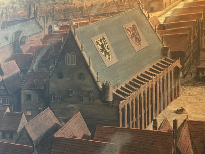 Flandern waren sehr begehrt). Dies bescherte der Stadt einen geradezu unverschämten Reichtum. Was man auch an allen Ecken und Enden sieht. Ich habe bisher noch keinen Altstadtkern gesehen der so reichhaltig ausgestattet ist. Brügge hatte im Spätmittelalter sogar einen überdachten Hafen, der recht groß war. Eine Einzigartigkeit im Europa des späten Mittelalters. Er befand sich an der Stelle an der sich heute die Gebäudereihe befindet, die vom Historium und dem Biermuseum begrenzt wird. Leider wurde er im 18. Jahrhundert abgerissen.