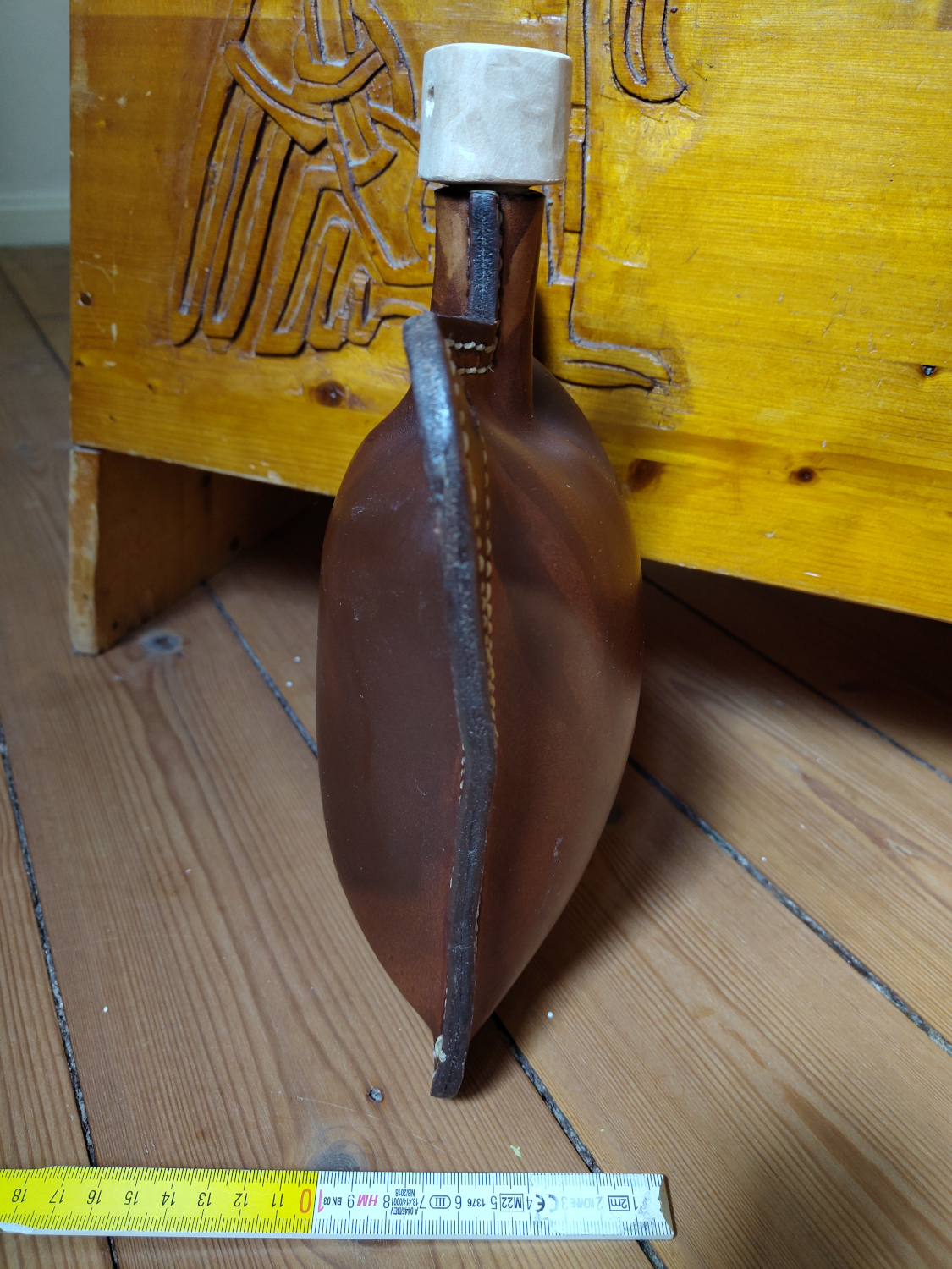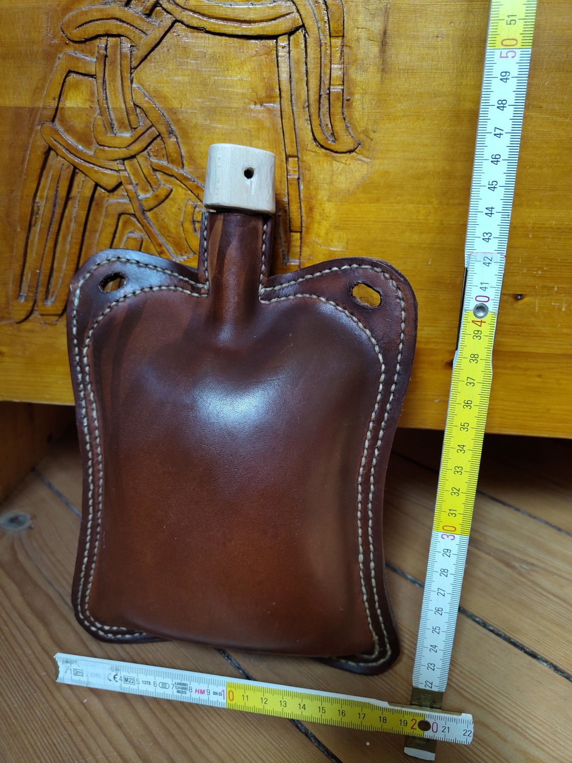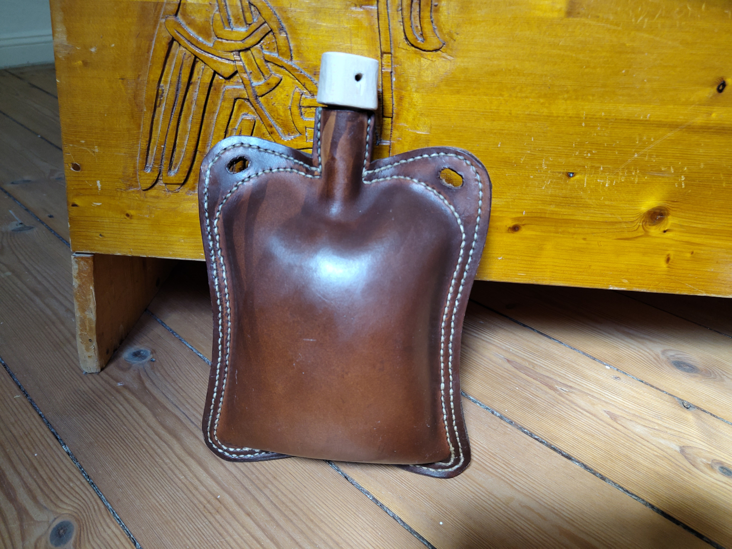 Die hier angebotene Flasche ist aus pflanzlich gegerbtem Leder genäht. Um einen Hohlraum für die Flüssigleit zu schaffen, wurde das Leder möglichst weit ausgedehnt. Abschließend wurde die Flasche mit lebensmittelechtem BIO Bienenwachs gedichtet.